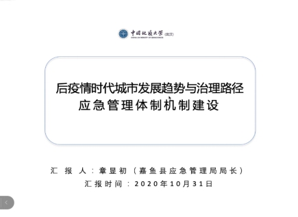 章显初局长结合自身工作经验,围绕“应急管理体制机制建设”,阐述了后疫情时代湖北省应急管理现状,从人员、机制、权责体系等方面对其存在的问题进行深入剖析,并提出有针对性的建议,为后疫情时代城市应急管理体制机制的建设提供重要参考。