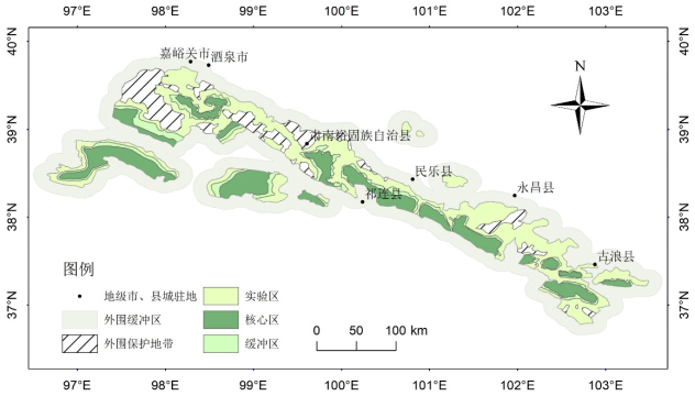 祁连山生态环境状况对区域及国家生态安全至关重要。祁连山自然保护区属森林生态系统类型的自然保护区,包括甘肃、青海两个片区,总面积为345.53万hm2。因其具有丰富的生物多样性,是水源涵养重要生态功能区,国务院于1988年将甘肃片区正式列为国家级自然保护区,并将整个保护区划分为核心区、缓冲区、实验区和外围保护地带四个功能区(图1)。