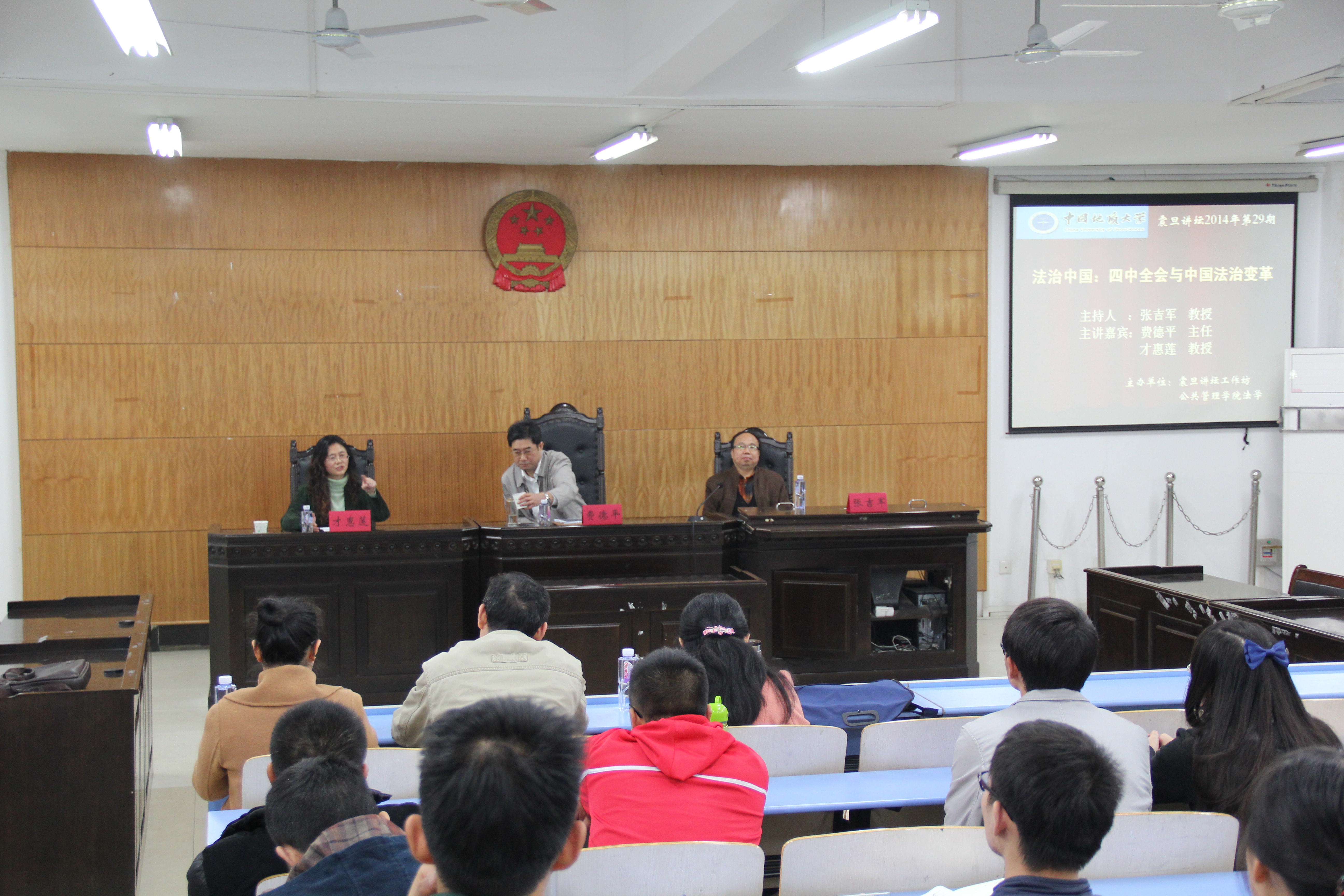 的资源环境特色和法学教学实践,针对费德平的讲座内容作了精彩点评。现场教师和同学通过提问与回答的方式与费德平老师进行了精彩的互动。参加此次讲座的教师学生都表示此次讲座使他们受益良多,对四中全会的决定与法治变革有了更加全面深刻的认识。