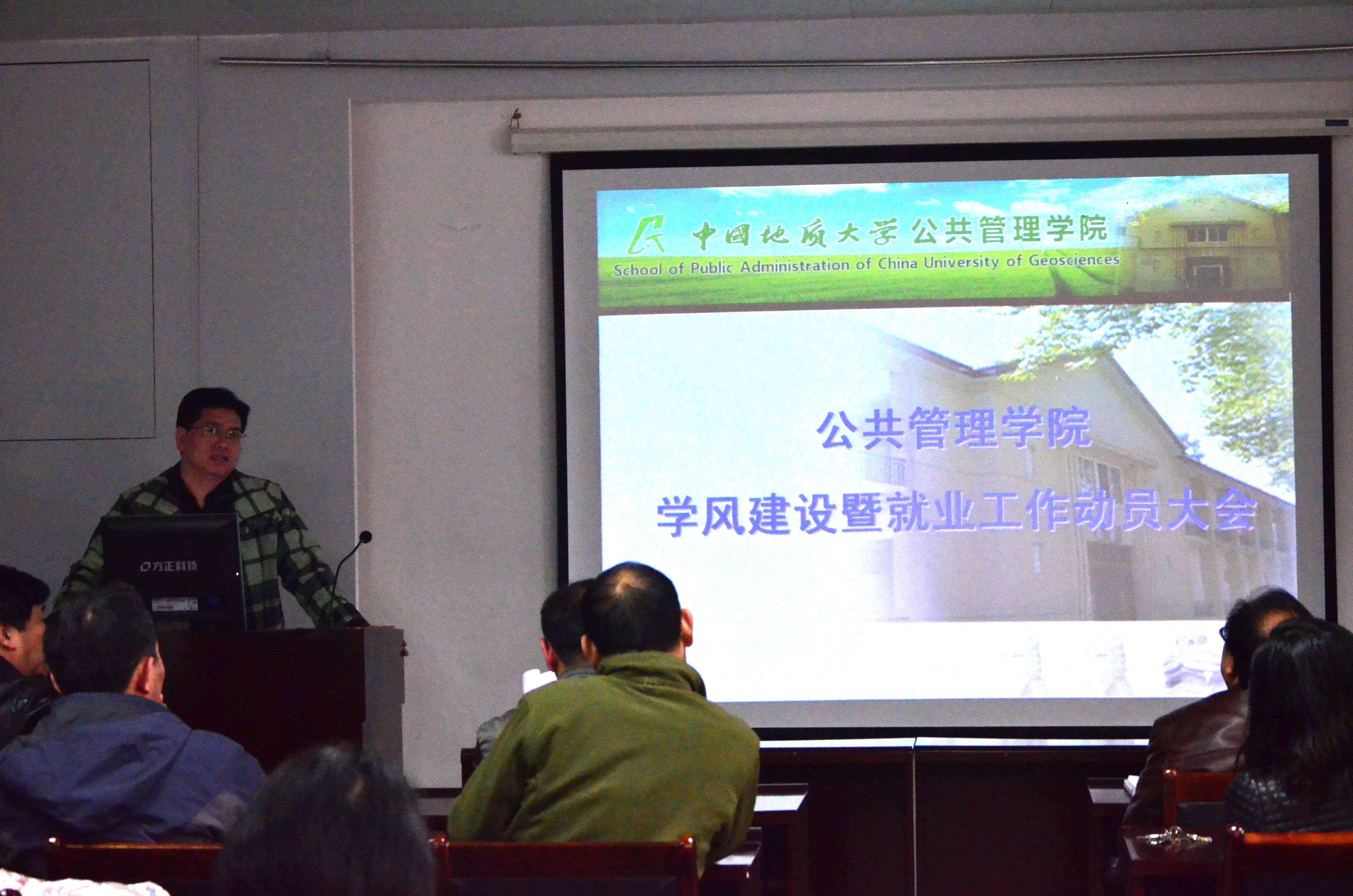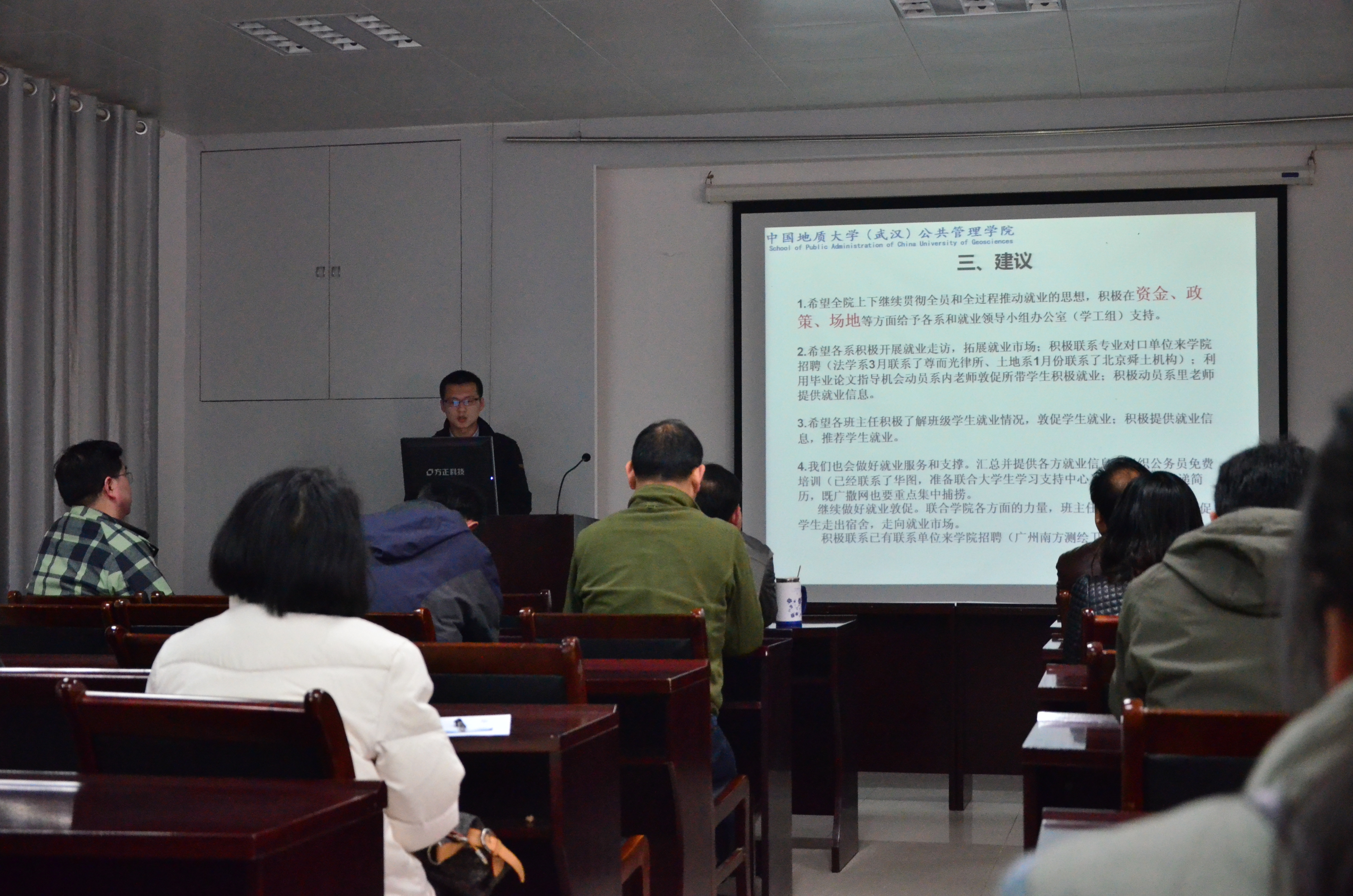国土法律评价实验室101顺利召开,参加此次会议的有学院党委书记张吉军、院长李江风,分管教学、科研、研究生工作的副院长,各系系主任及2015届本科毕业班各班班主任、部分研究生导师、学工组全体老师。会议由党委副书记胡文勤老师主持。