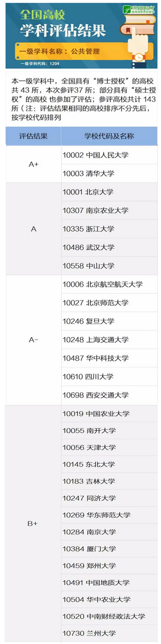2017年12月28日,教育部学位与研究生教育发展中心公布了全国第四轮学科评估的结果。全国共有143所高校参加了本轮公共管理一级学科评估,第一版主网
