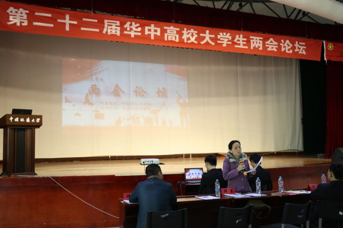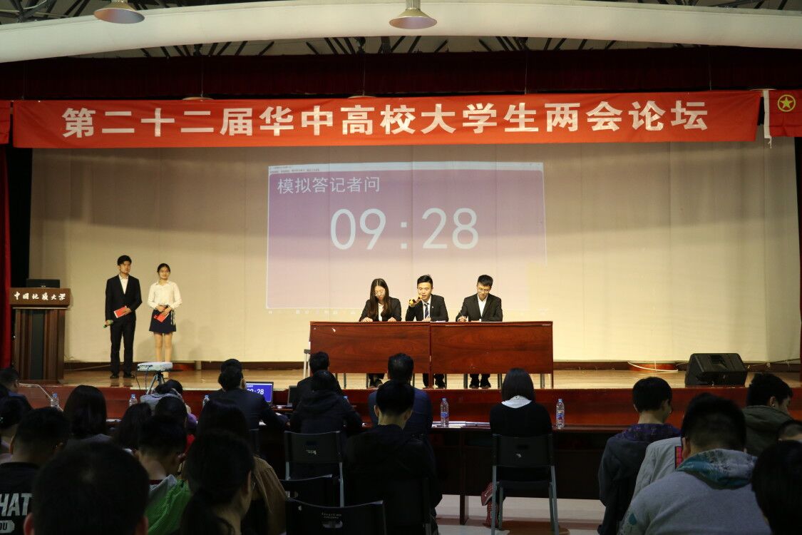 举办的“第二十二期华中高校大学生两会论坛”在大学生活动中心二楼演播厅举行。担任此次活动的评委老师有学工处副处长张建和老师、校团委副书记姜明敏老师、马克思主义学院李敏伦老师、第一版主网