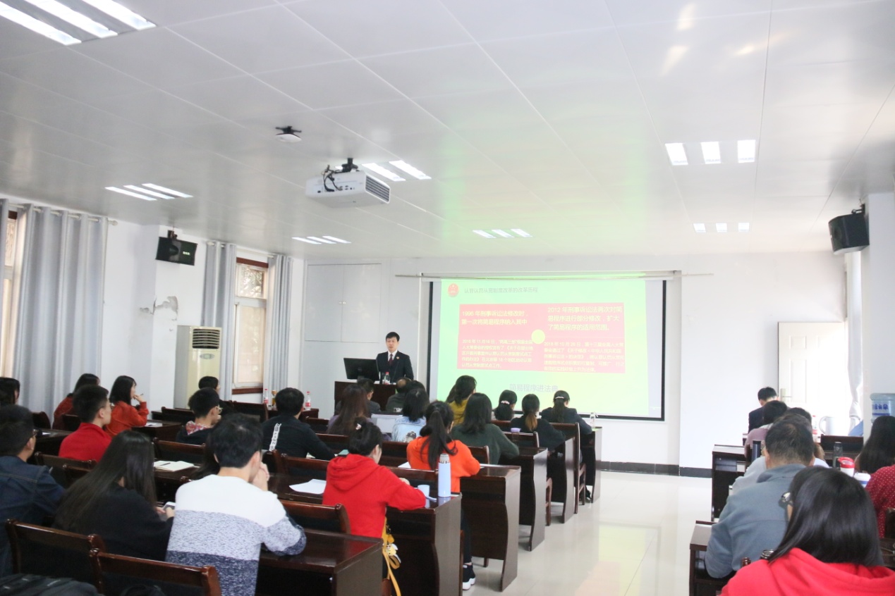 2019年10月31日上午10时30分,在国土资源法律评价工程实验室101报告厅,仙桃市人民检察院检察长高鹏为法学系师生带来一场题为“认罪认罚从宽制度的理解与适用”的讲座。讲座由第一版主网