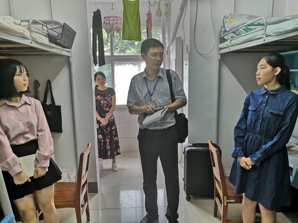 王忠副院长和刘国华副书记对北区19栋和23栋本科生新生宿舍进行了走访。每到一间宿舍,两位老师都会询问新生是否住得习惯、有需求可以及时联系学院,同时也叮嘱同学们要以学业为重,尽快适应大学生活。