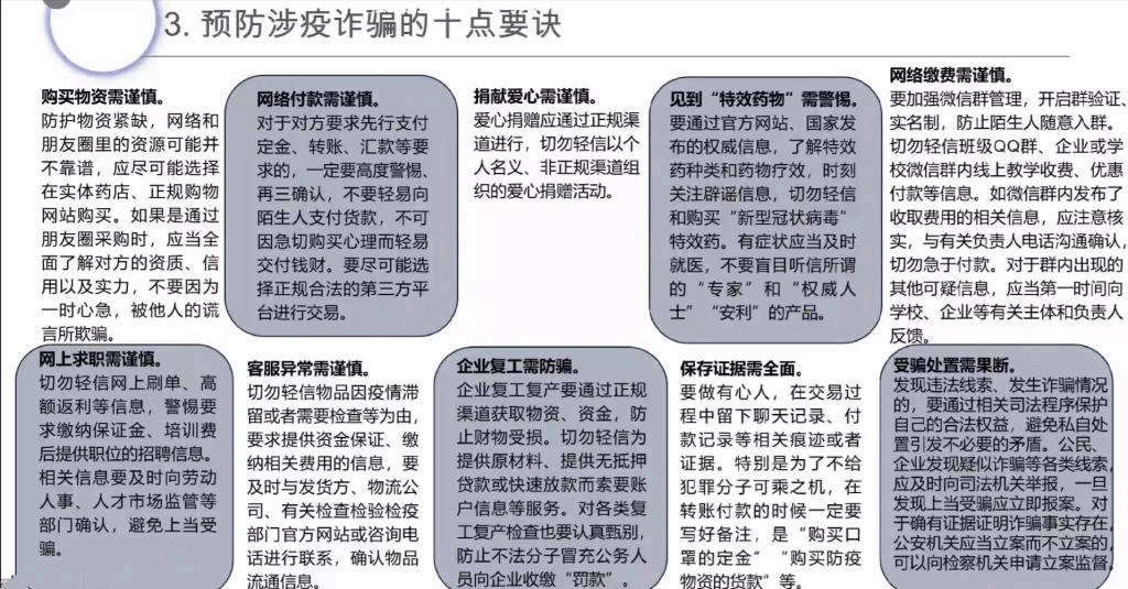 夏老师介绍了2020年1月20日,国家卫健委明确将新型冠状病毒感染的肺炎纳入《中华人民共和国传染病防治法》规定管理的乙类传染病,采取甲类传染病预防、控制措施。她讲述了新冠肺炎防治所涉的法律问题,剖析了许多涉嫌违法且会得到法律严惩的典型案例,并对大学生“依法抗疫”提出了若干建议。她说,作为一个大学生首先应该树立法律意识,模范遵守法律,不信谣不传谣,并且坚决抵制违法行为,其次可以依法依规参与志愿活动,最后特别提醒大学生牢记十点要诀,注意预防涉疫诈骗。