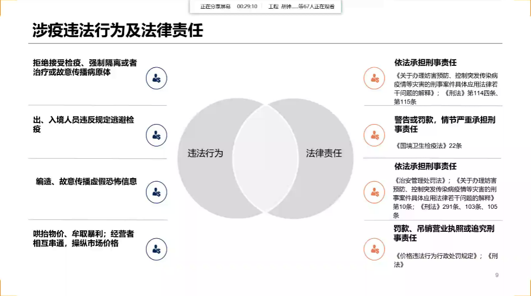 此次讲座围绕着“怎样依法防疫”展开,分为四个板块,分别是依法抗疫的法律依据、涉疫的违法行为及法律责任、典型案例分析及大学生依法抗疫的若干建议。