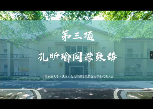 相信新一届代表能以本次大会为契机,不忘初心,牢记使命。正如习近平总书记在致全国学联二十六的贺信中写道“学联事业是党的群团事业的重要组成部分,学联组织一定要不断保持和增强政治性、先进性、群众性,更好组织动员广大青年坚定跟党走。”进一步领导学生们积极投身学校学院建设与发展,为实现中国梦、地大梦、公管梦、个人梦奠定更加坚的基础。