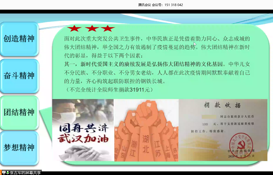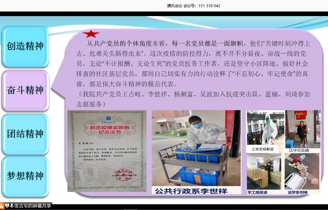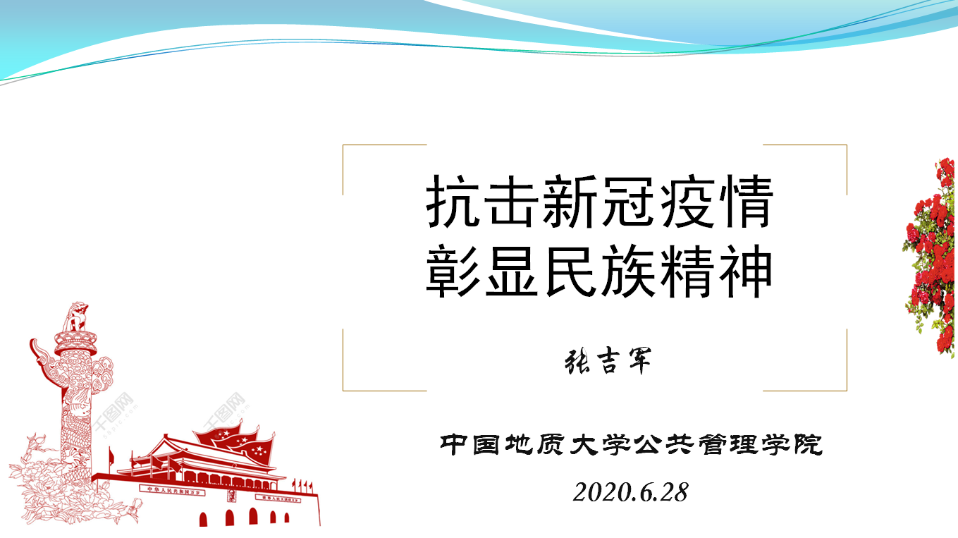 张吉军书记紧密围绕习近平总书记关于疫情防控重要讲话和指示批示精神,以《抗击新冠疫情彰显民族精神》为题,为全院教师党员讲授一堂专题“微党课”。他谈到,习近平总书记多次强调,实现中国梦必须弘扬中华民族精神。突如其来的新冠肺炎疫情,既是对我国治理体系和治理能力的一次大考,也是呼唤、锤炼和发扬中华民族精神的战场。在这场抗击疫情的人民战争中,我们发挥集中力量办大事的制度优势,全国上下迅速形成了抗击疫情的强大合力,充分展现了中国力量、中国效率、民族精神。他围绕“独辟蹊径勇于探索的伟大创造精神、自强不息只争朝夕的伟大奋斗精神、勠力同心众志成城的伟大团结精神、双战双赢命运与共的伟大梦想精神”四个方面的内容展开讲解。他谈到,从我们党执政的整体角度而言,作为中国特色社会主义事业的领导核心,中国共产党面对重大突发事件所展现的总揽全局、协调各方的强大动员能力、组织能力和执行能力,开创了一个又一个“中国奇迹”。从共产党员的个体角度来看,每一名党员都是一面旗帜,他们“关键时刻冲得上去、危难关头豁得出来”。这次疫情的防控得力,离不开不分昼夜、奋战一线的党员,无论“不计报酬、无论生死”的党员医务工作者,还是坚守小区阵地、做好社会排查的社区基层党员,都用自己切实有力的行动诠释了“不忘初心、牢记使命”的真谛,都是伟大奋斗精神的模范代表。他们“关键时刻冲得上去、危难关头豁得出来”。“人无精神则不立,国无精神则不强。”中华民族在庚子年初彰显的“抗疫精神”,是伟大民族精神的时代剪影和集中升华,是疫情防控阻击战取得重大战略成果的“精神武器”。在实现“两个一百年”奋斗目标的历史交汇之年,我们更加需要强化中华民族精神的“硬核”力量,提升中华民族的战斗力,激励中华儿女乘风破浪、一往无前,朝着中华民族伟大复兴奋勇前进。张吉军书记要求全院党员师生围绕“微党课”的学习,进一步深入交流研讨,碰撞思想火花,总结“抗疫”经验,发扬“抗疫”精神,发挥党员先锋作用,共同谱写学院改革发展的新篇章。