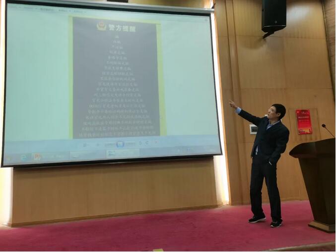然后,王东警长细致地讲解了买卖游戏账号及装备类、冒充公检法国家机关类、假冒熟人或领导类三种诈骗。王警长用多个鲜活的案例展现了发生在大学生身边的受骗案例,剖析了骗子的四步作案法,再次加强了同学们对诈骗手法深刻而清晰的防范意识,提高了大家对自身财产和生命安全重要性的认识。