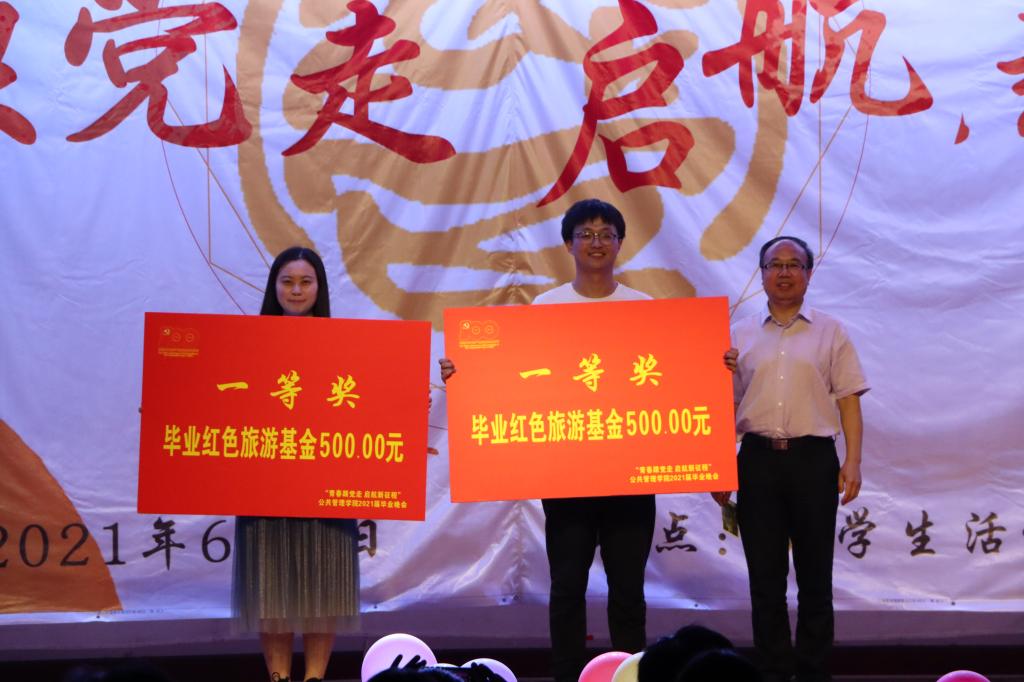学院党委书记张吉军上台抽取一等奖。一等奖设置2项,均为毕业红色旅游基金500元。一等奖奖项设置响应建党100周年献礼及党史学习要求,为获奖同学提供红色旅游基金,将党史学习与毕业教育相结合,鼓励毕业生同学在实践中学习党史,在红色旅行中感悟党的百年辉煌征程。