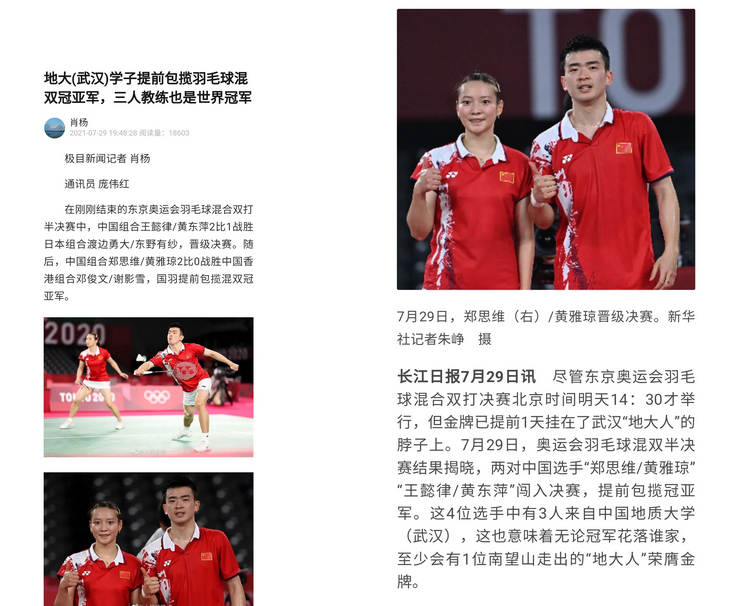 “羽毛球一直都是地大体育学院的传统优势项目。”邹师思介绍,3人都曾代表地大参加大型赛事。郑思维和黄雅琼曾代表第一版主网