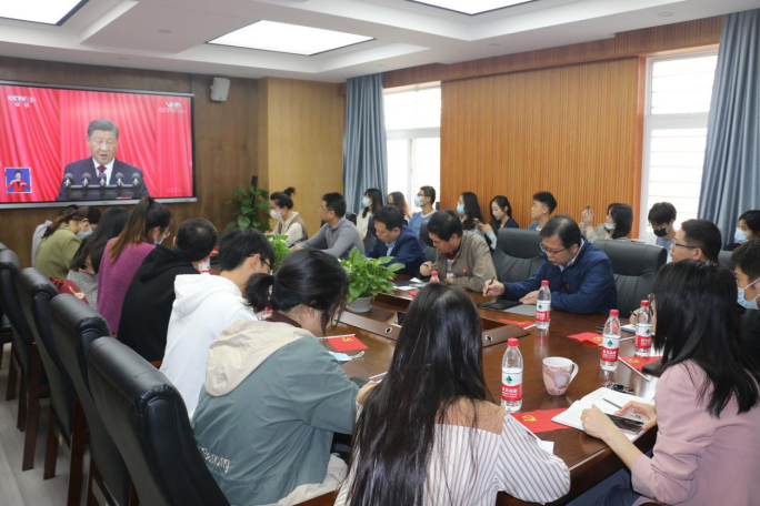 学院领导、学生党支部书记、团学骨干、教师代表、学生代表在227会议室集中组织收看、学习。各系以支部为单位组织收看,学生使用手机、电脑终端收看直播。