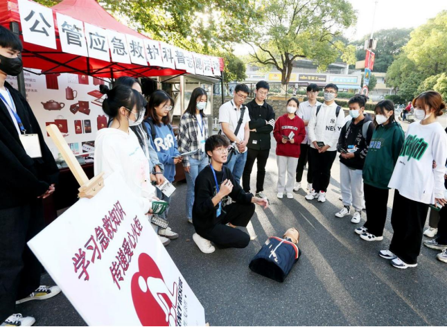 在全国高校率先设立建设应急管理专业,开设应急救护课程,提高学生应急救护处理突发事件能力,更好服务社会大众。(湖北日报全媒记者 张鸿 通讯员 屠傲凌 摄 )