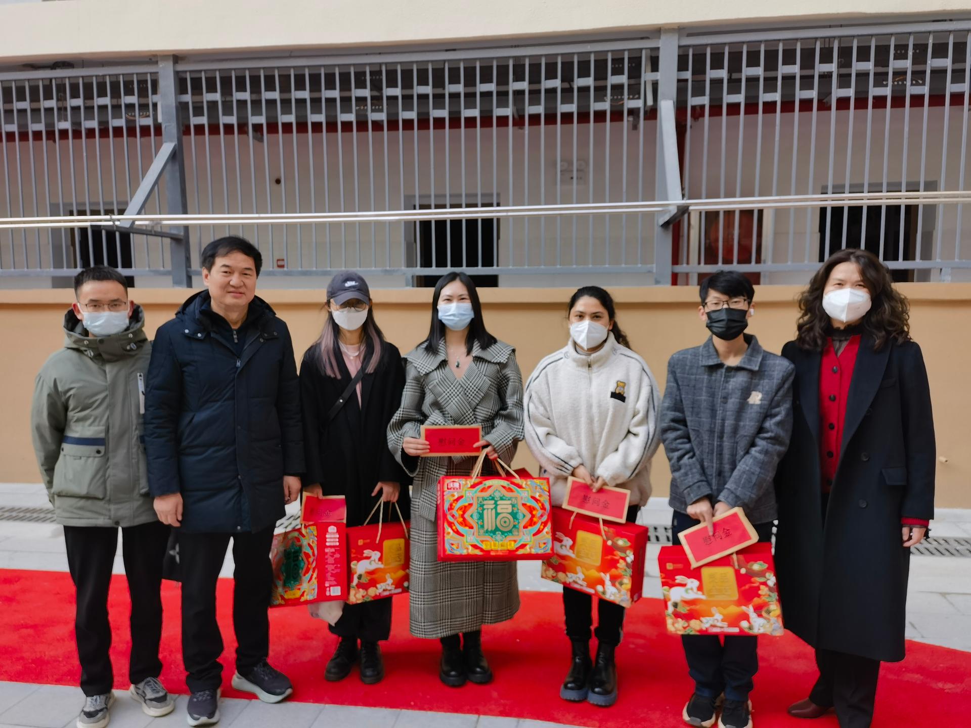 党委书记张宽裕、党委副书记龚丽、办公室主任彭珂、辅导员王青涛来到南望山校区54栋、57栋,走访慰问学院春节留校学生,送去新春祝福、慰问金和礼包。