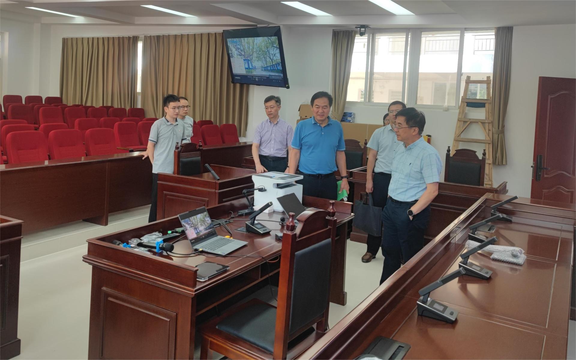 数字智能化升级改造后的模拟法庭。王校长简要询问了模拟法庭的数字设备配置运行情况和使用效果,并就新时代法律人才培养标准、法学实践教学基地建设和毕业生就业等问题与第一版主网