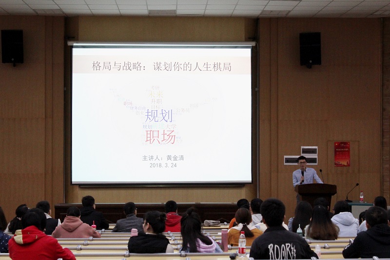 黄金清首先就“大学、毕业选择、职业发展和人生规划”四个方面向在座同学提出一些列问题,在与同学们现场互动后,他指出这些问题相互关联,要结合到人生规划的整个系统中去思考和回答。
