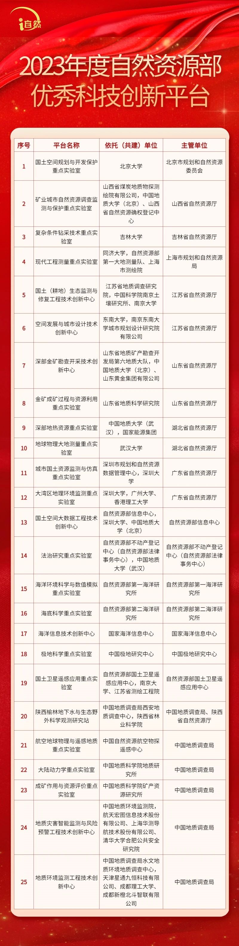 本轮优秀科技创新平台评选范围涵盖通过评估、建设的262个自然资源部科技创新平台,包括109个重点实验室、86个工程技术创新中心、67个野外科学观测研究站,经审核推荐与综合评议,共产生25个优秀科技创新平台。